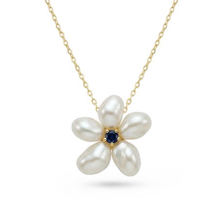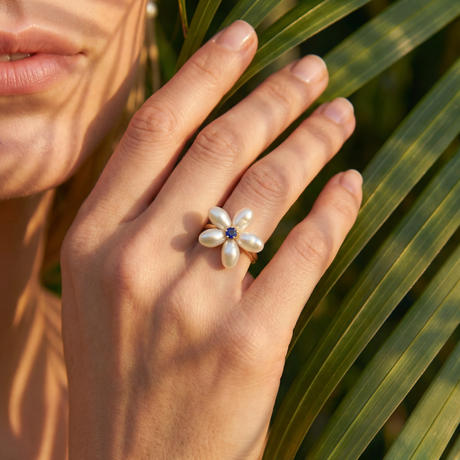 For our flower child, with delicate keshi pearls arranged around a central natural blue sapphire of the deepest blue, reminiscent of the waters around our pearl farms.